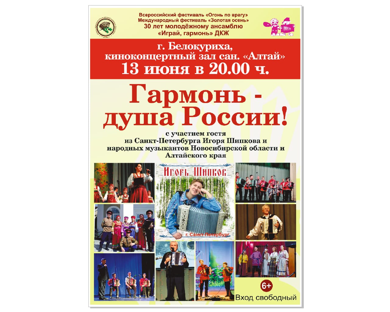 13 июня в 20:00 начало концерта Гармонь – душа России, он пройдет в киноконцертном зале санатория “Алтай”, в городе Белокуриха, Алтайского края. С участием гостя из Санкт-Петербурга Игоря Шишкова и народных музыкантов Новосибирской области и Алтайского края. Концерт пройдет при поддержке: Всероссийского фестиваля “Огонь по врагу”, Международного фестиваля “Золотая осень”. К 30 летию молодежного ансамбля “Играй, гармонь” ДКЖ. Вход свободный.